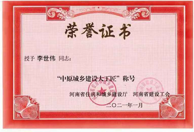 天津凯乐游戏开发有限公司李世伟同志获“中原城乡建设大工匠”称号